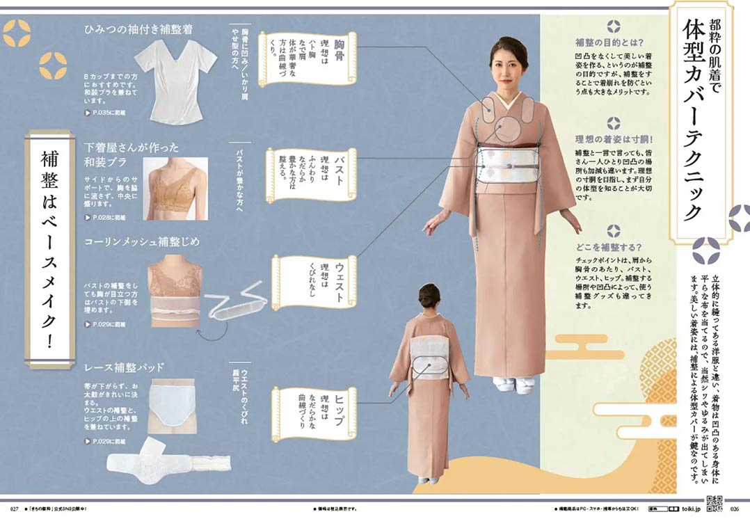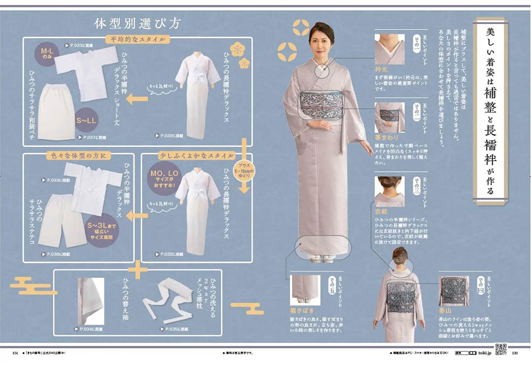 また、「都粋の肌着で体型カバーテクニック」や「美しい着姿は補整と長襦袢が作る」では、補整のポイントをわかりやすく解説し、どのような体型の方でも、きものを美しく着こなせるヒントを詰め込みました。
