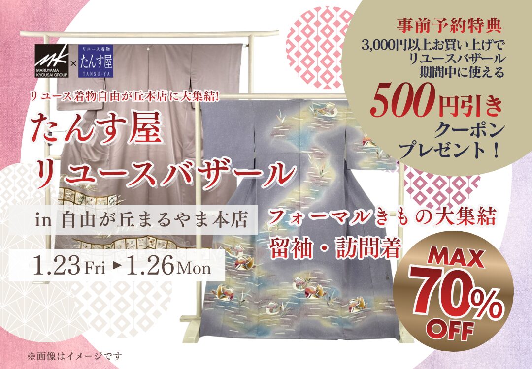 まるやま・京彩グループ、自由が丘まるやま本店では、1月23日(金)〜26日(月)の4日間、リユース着物が当社通常販売価格から最大70%OFFとなる「リユースバザール in 自由が丘まるやま本店」を開催いたします。